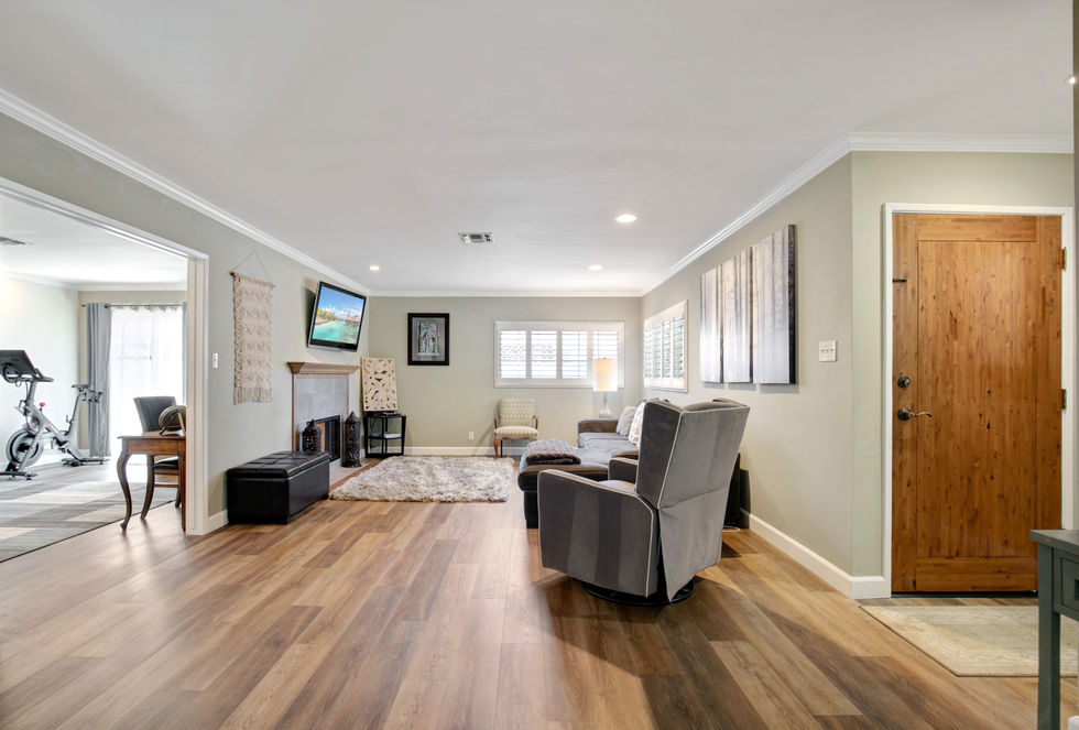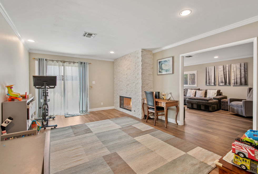 Remodeled home on beautiful street South of Ventura Blvd. between Canoga and Alhama Dr. 3 bedrooms (tax assr. says 2) plus spacious living room and a huge family room both with marble fireplace, crown moldings & recessed lighting. Separate dining room off kitchen. Kitchen is updated with granite counters stainless appliances, crown moldings. Master bedroom features private bath with updated vanity & tile floor. Updated windows & sliders, possible copper plumbing. Yard has stained concrete and patio, great for kids to ride toys plus pool & spa surrounded by tropical landscaping. Detached 2 car finished garage.